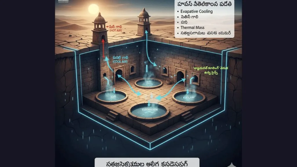ఎవాపరేటివ్ కూలింగ్ (Evaporative Cooling): నీరు ఆవిరి అయ్యేటప్పుడు చుట్టుపక్కల వాతావరణం నుండి వేడిని గ్రహిస్తుంది. ఇది గాలిని చల్లబరుస్తుంది. కుండలు, మెట్ల బావులు ఈ సూత్రంపైనే పనిచేశాయి.